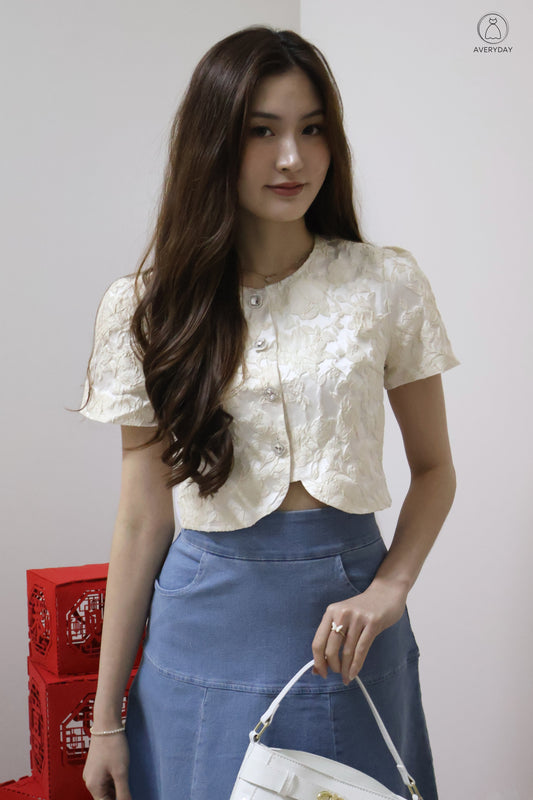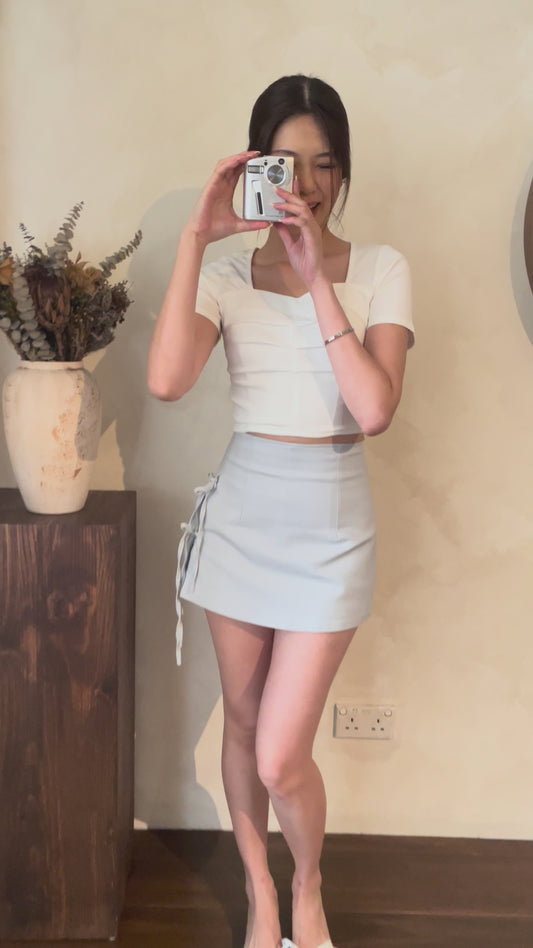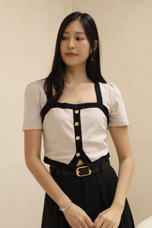 Gabriella Petal Pearl Buttons Ruched Top In Grey