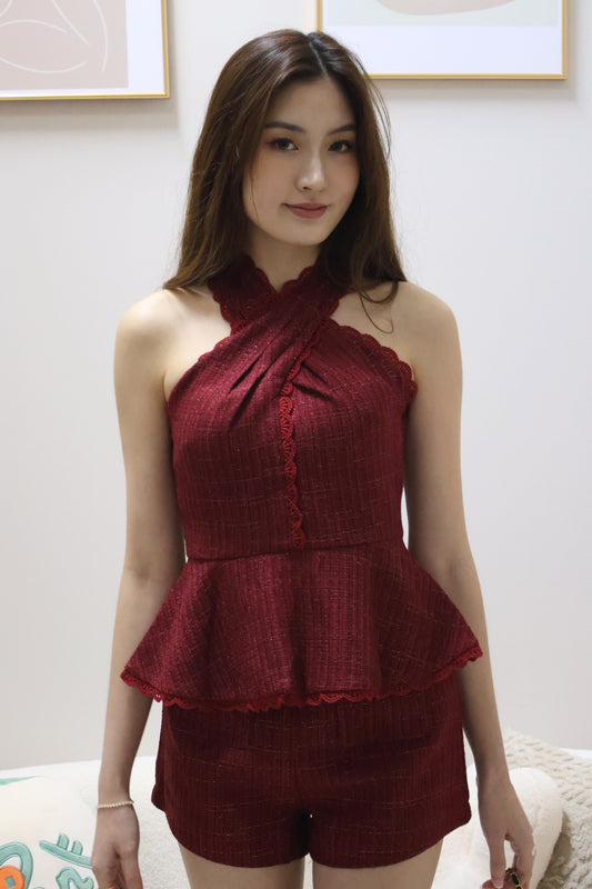 Chelsy Pearl Button Bubble Hem Co-Ords Set In Black