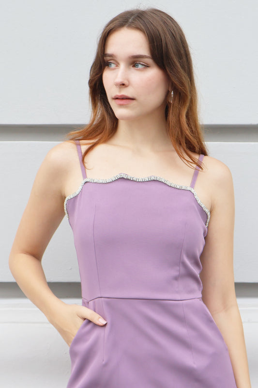 Kacy Scallop Embellished Romper Dress in Purple