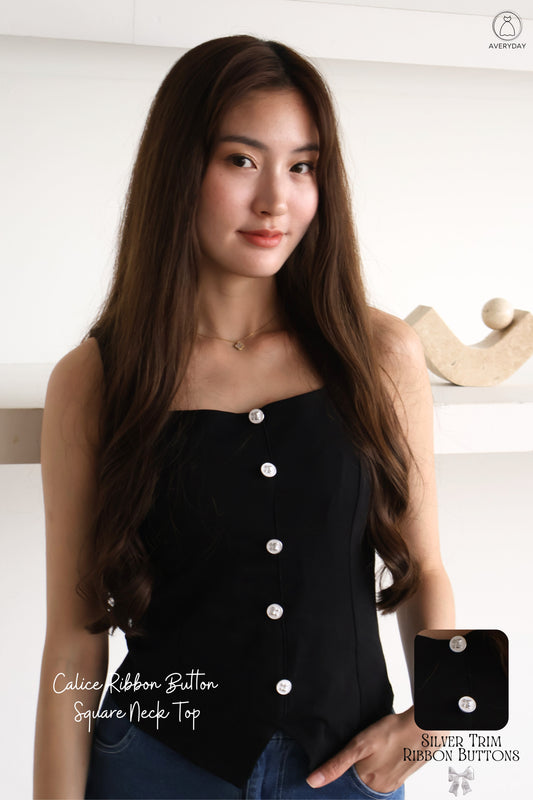 Calice Ribbon Button Square Neck Top In Navy Blue