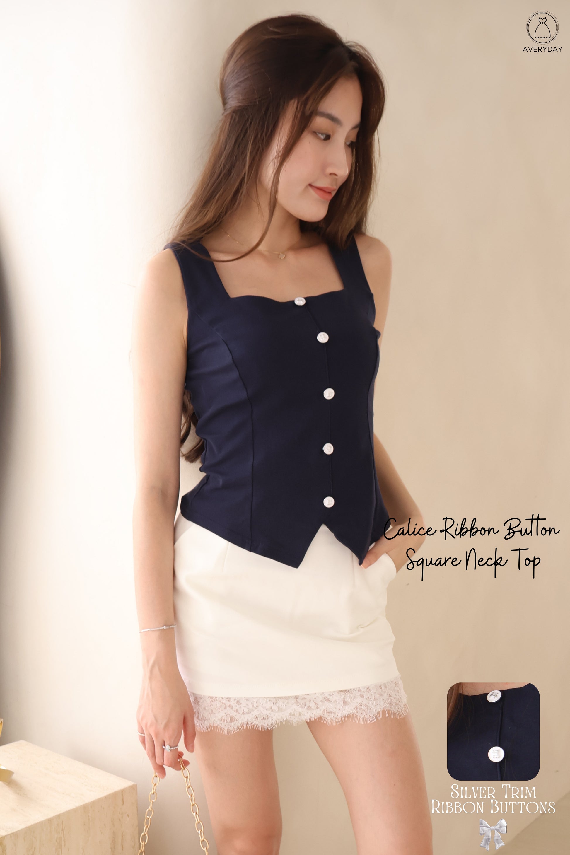 A timeless staple with a feminine twist. Calice features a chic square neckline for that refined touch, elevated with silver-trim ribbon buttons that instantly catch the eye. A subtle V-cut hem adds elegance while creating a flattering finish.