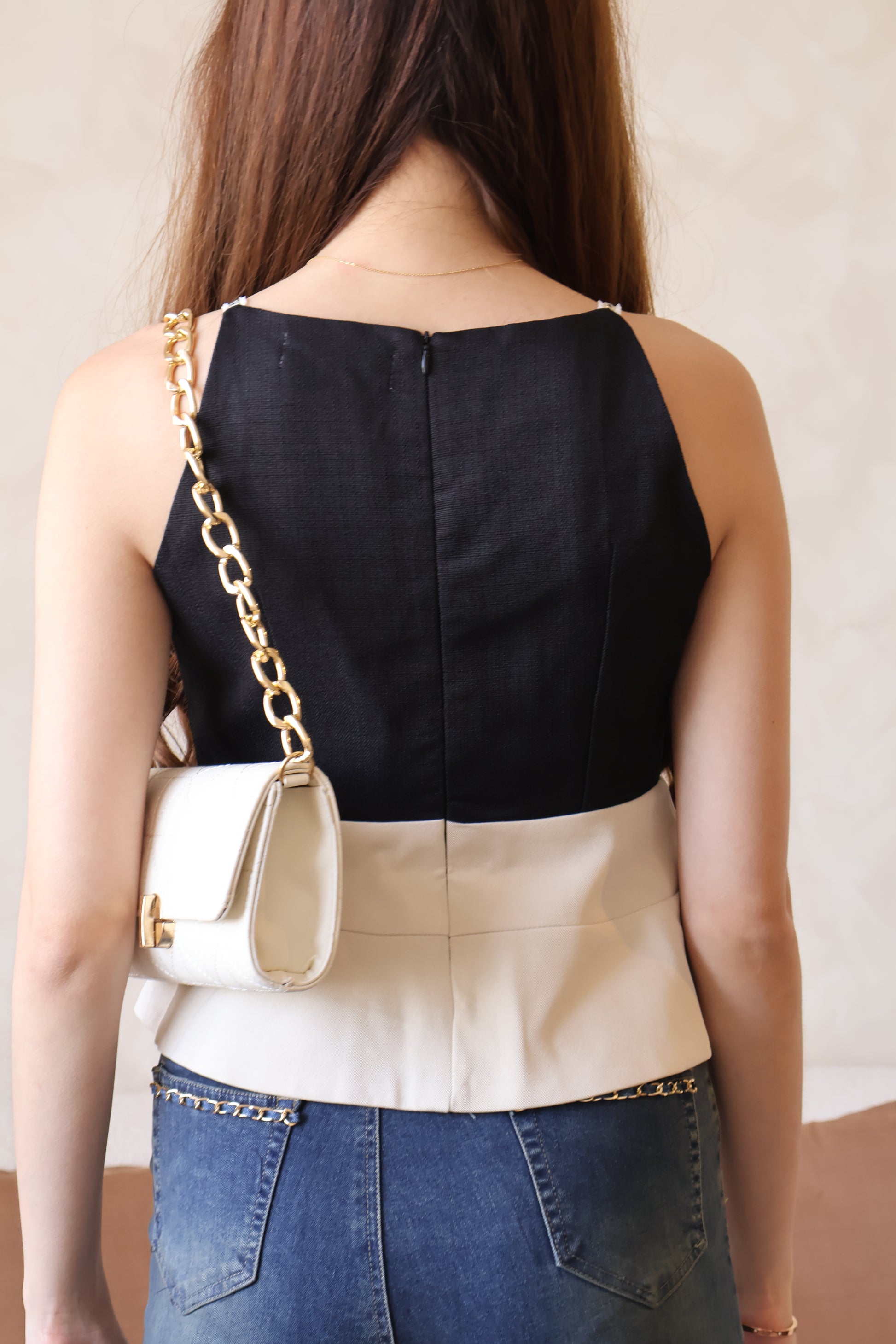 Designed with chic contrast tones and finished with a detachable camellia flower pin, Claudia exudes that rich-heiress aura with ease. Its subtle peplum flare at the hem adds a graceful, feminine silhouette that flatters effortlessly.