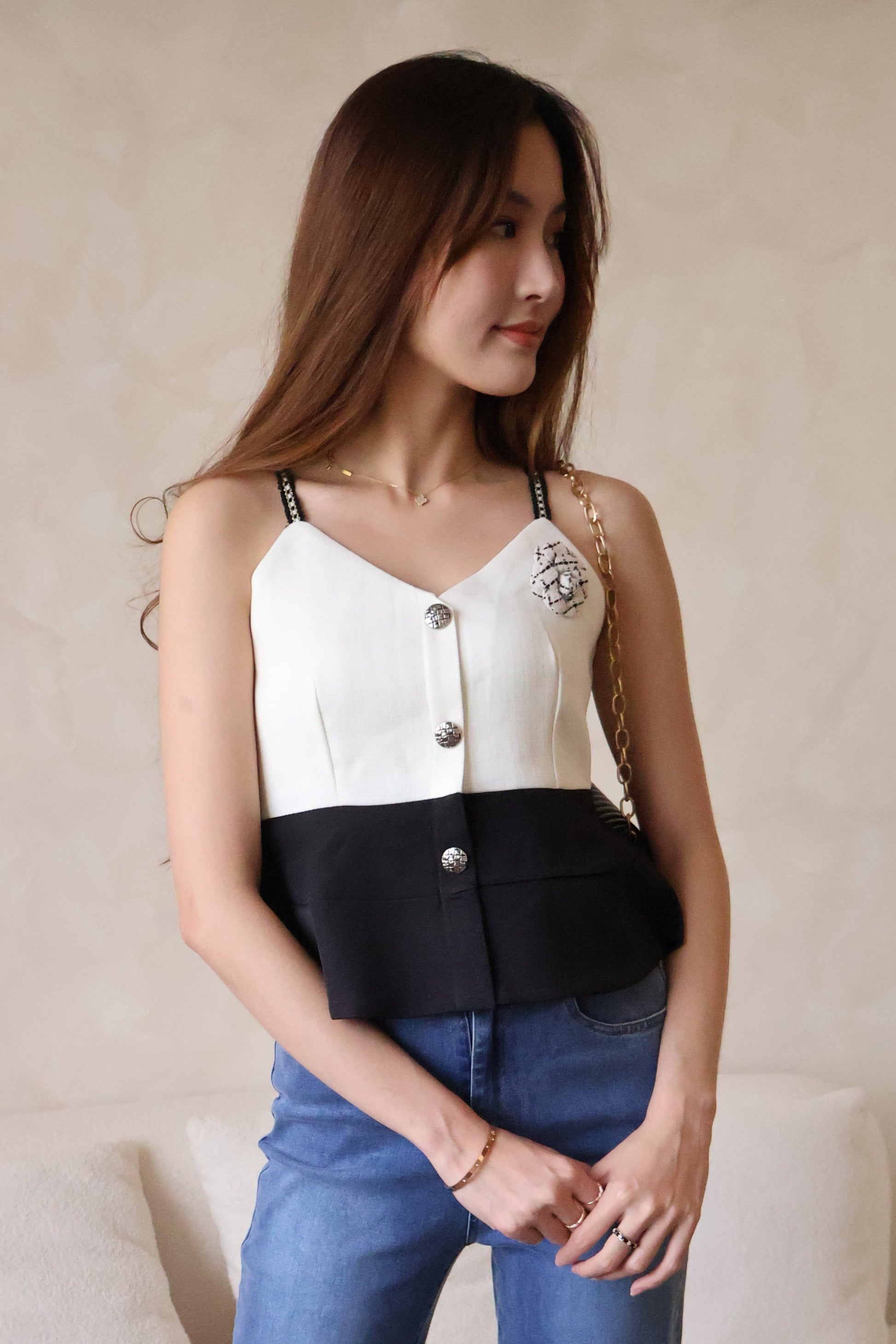Designed with chic contrast tones and finished with a detachable camellia flower pin, Claudia exudes that rich-heiress aura with ease. Its subtle peplum flare at the hem adds a graceful, feminine silhouette that flatters effortlessly.