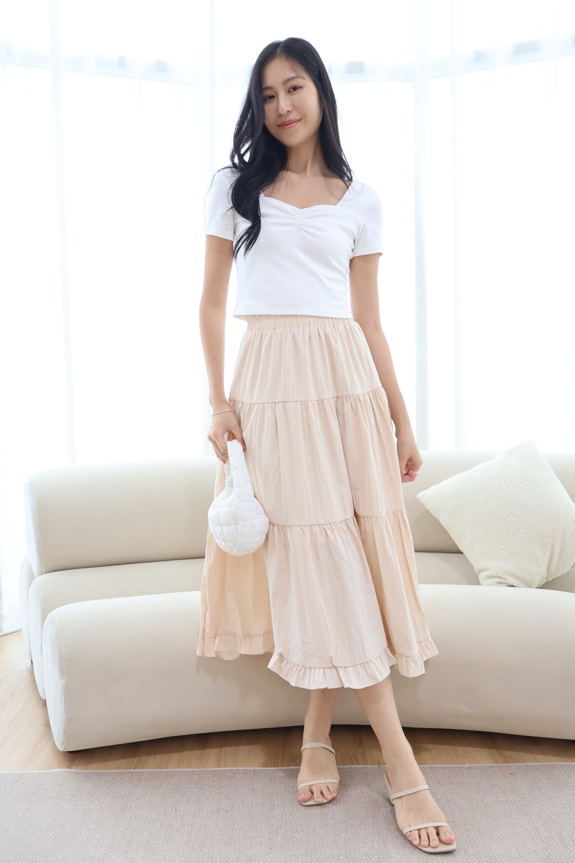 Designed with a layered maxi silhouette, this skirt exudes class and grace while maintaining a casual, laid-back vibe. The subtle ruffle hem adds a soft, feminine touch, making it the perfect flowy piece for everyday wear.