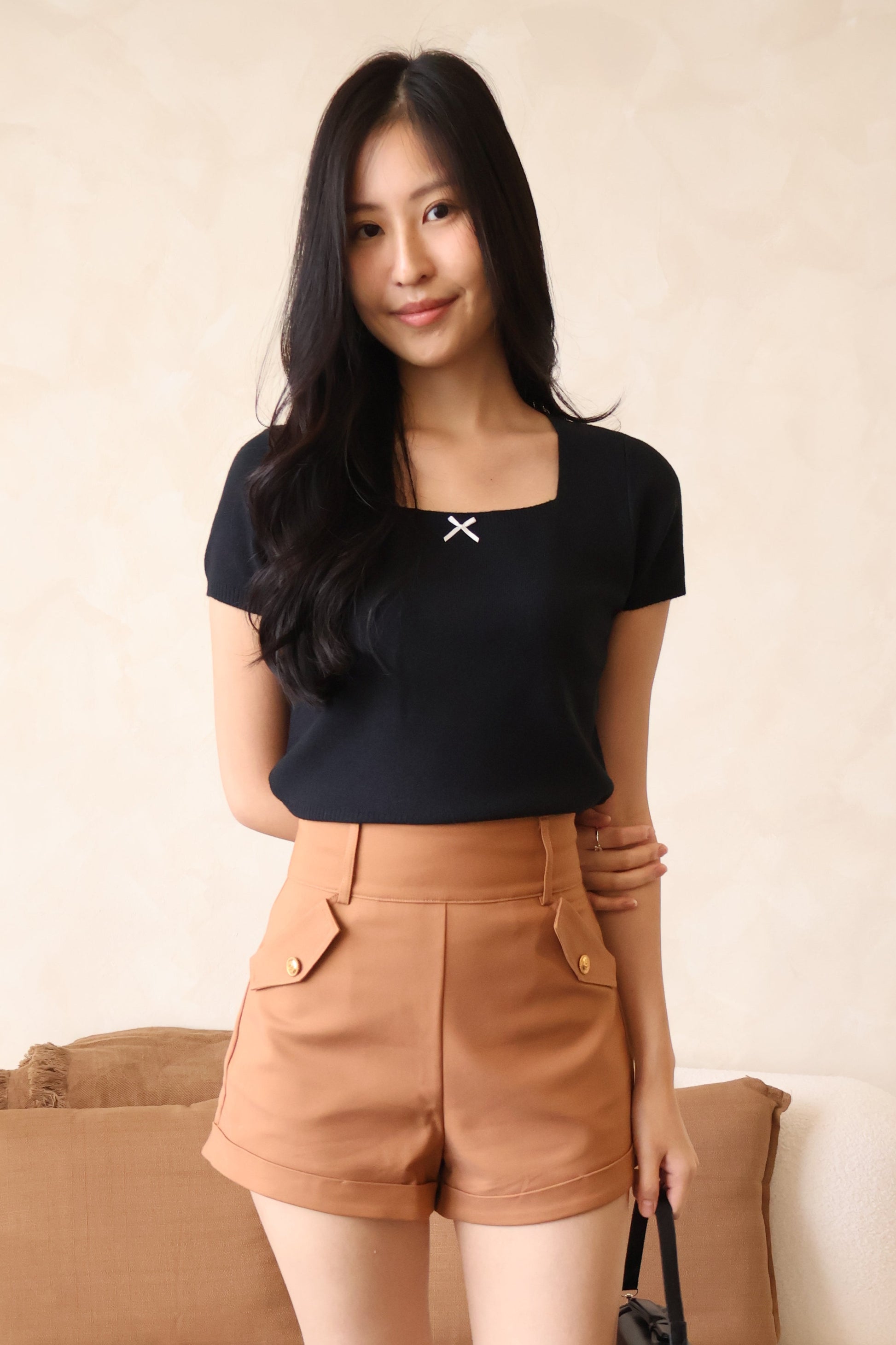 Crafted in a slightly longer length for a refined, posh feel, these high-waisted shorts elongate your silhouette while adding a touch of understated elegance. Gold button details elevate the look with a hint of luxury, while the functional side pockets keep it practical for your day-to-day.