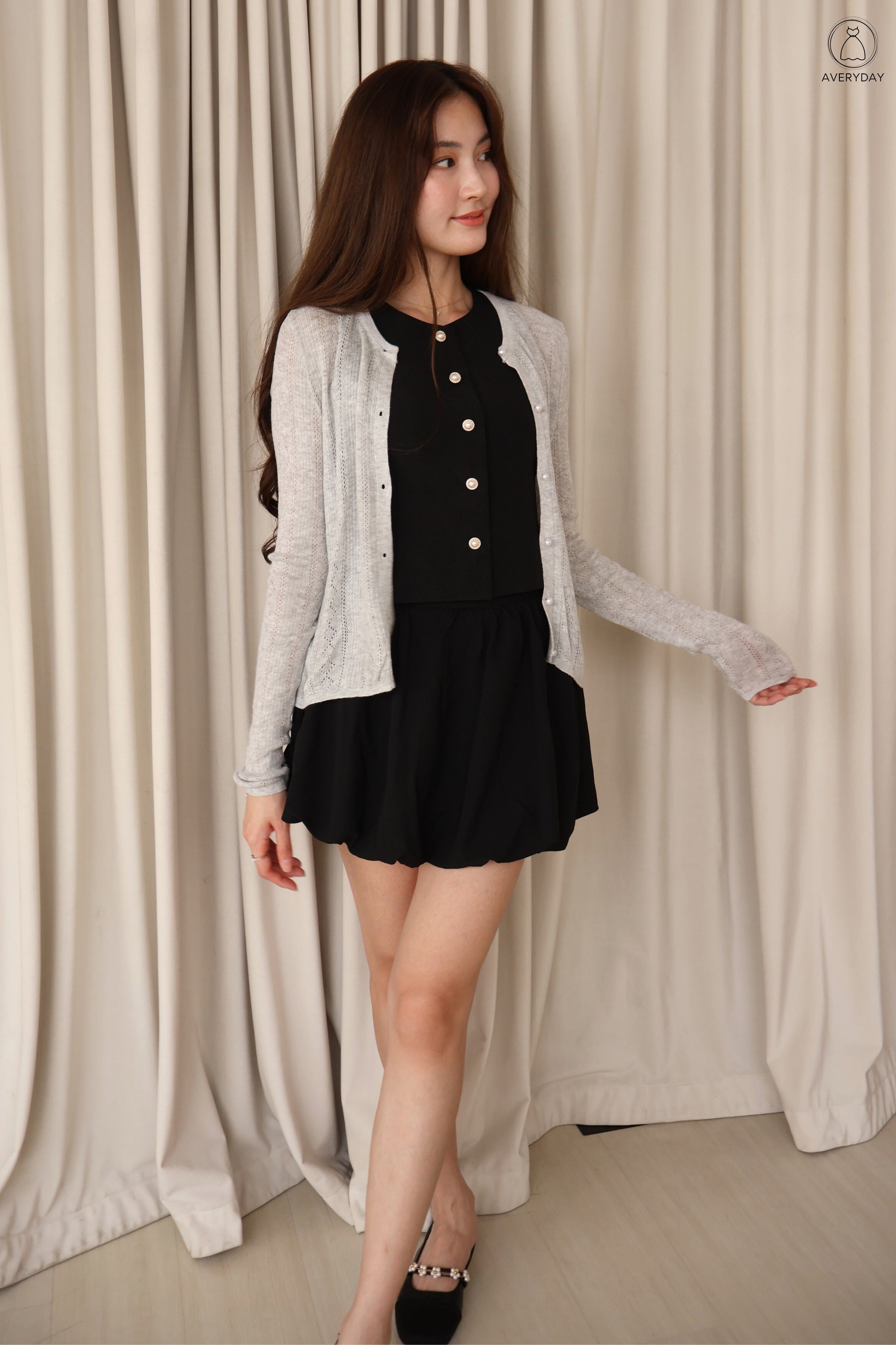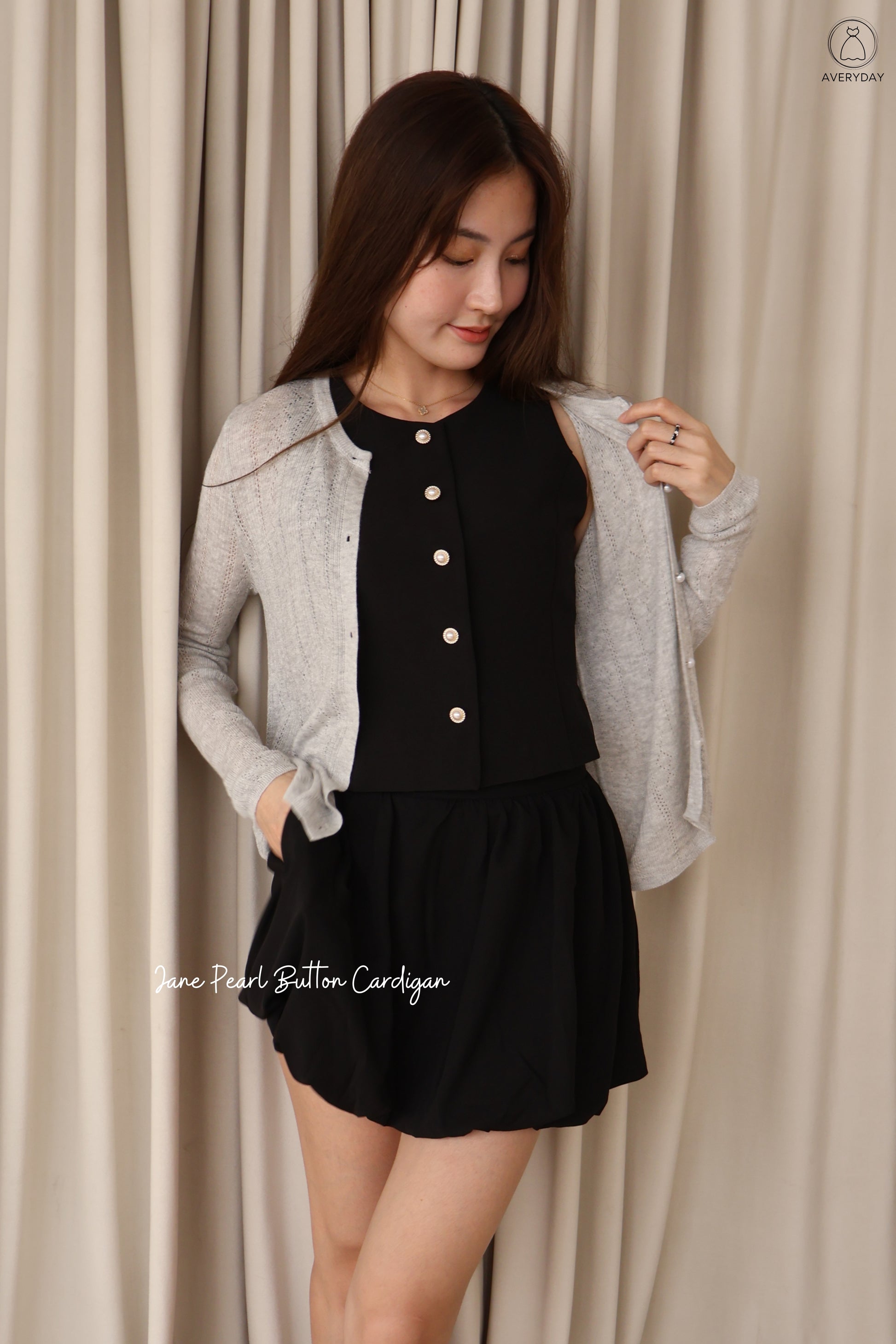 Delicate pearl buttons elevate this classic piece with a touch of elegance, while subtle cut-outs add a graceful, feminine detail that makes it stand out from your usual basics. Available in dreamy soft grey and blush pink, Jane pairs effortlessly with dresses, skirts, or your everyday denim.