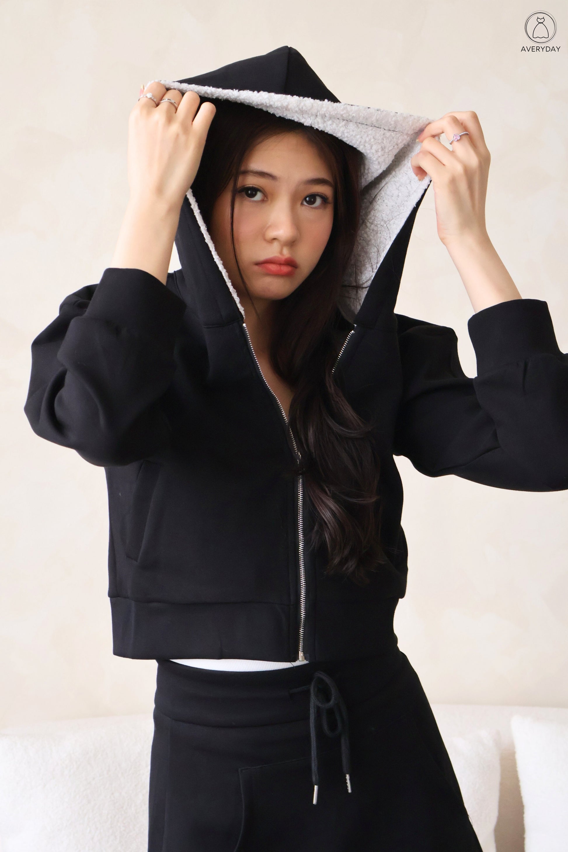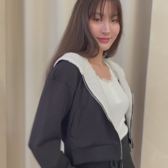 Featuring a relaxed hoodie paired with matching skorts, both complete with functional pockets for everyday ease. The soft furry inner side panels add a plush, cute detail without making it too warm, as the back is kept unlined for breezy wear.
