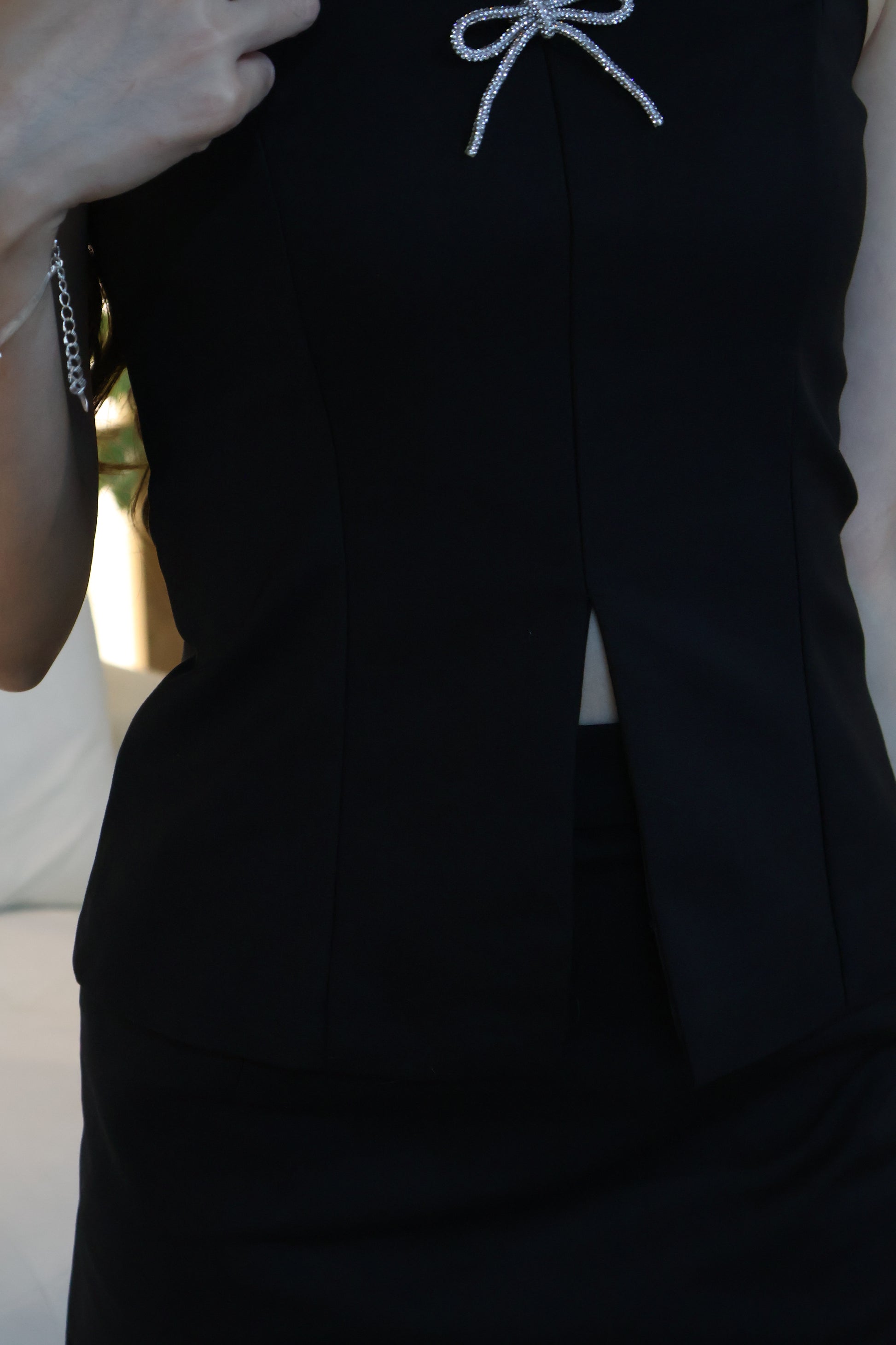 What sets this co-ord apart? A detachable bling ribbon that adds just the right touch of glam. Wear it for a standout look, or remove it for a cleaner, more versatile fit — perfect under a blazer for office-ready vibes.