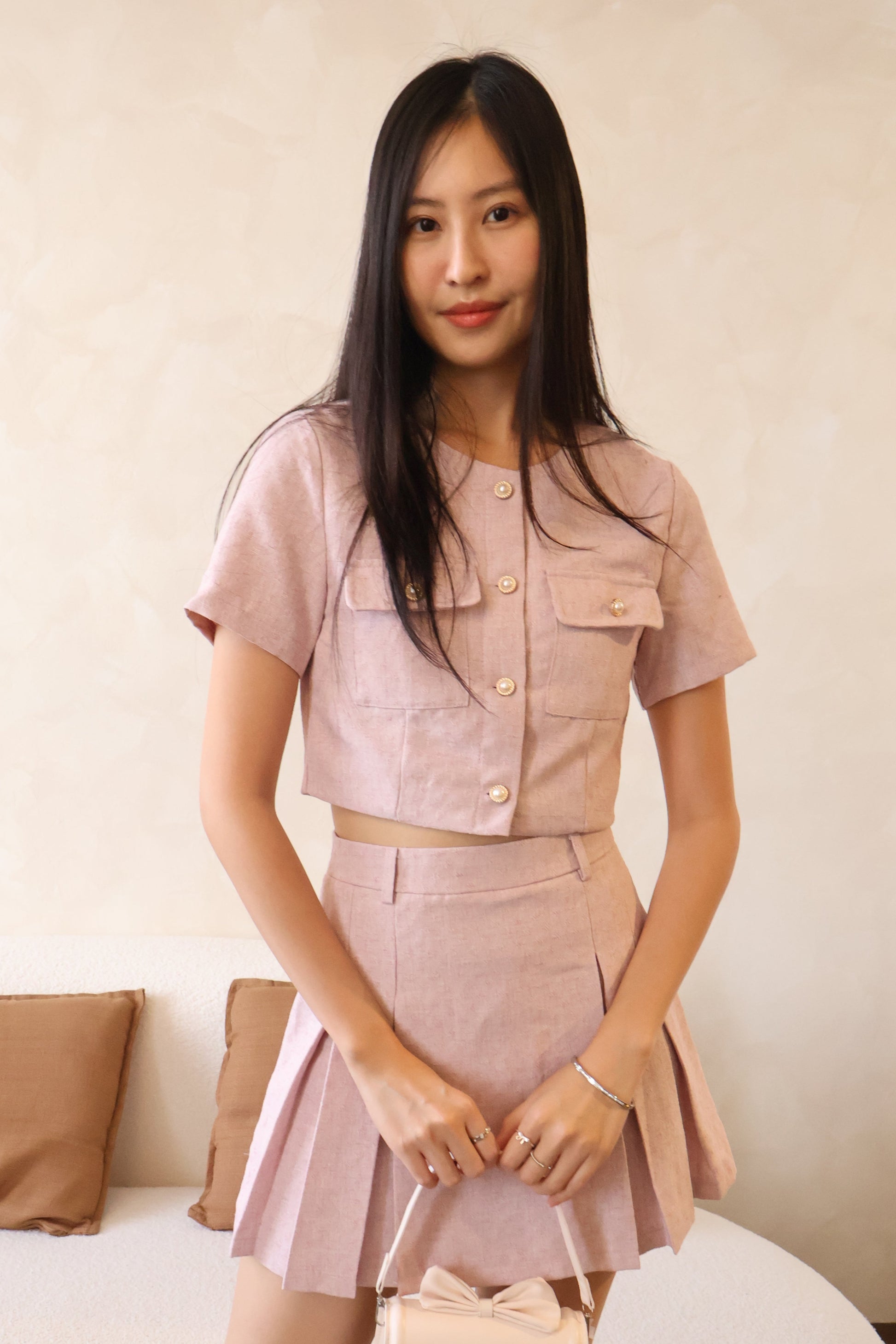 The top is adorned with gold-rimmed pearl buttons, adding a touch of class and polish, while the pleated skorts bring a sweet, feminine finish to the look. Whether you're heading to a smart casual event, a brunch date, or just want an effortlessly styled fit, Minny has you covered.