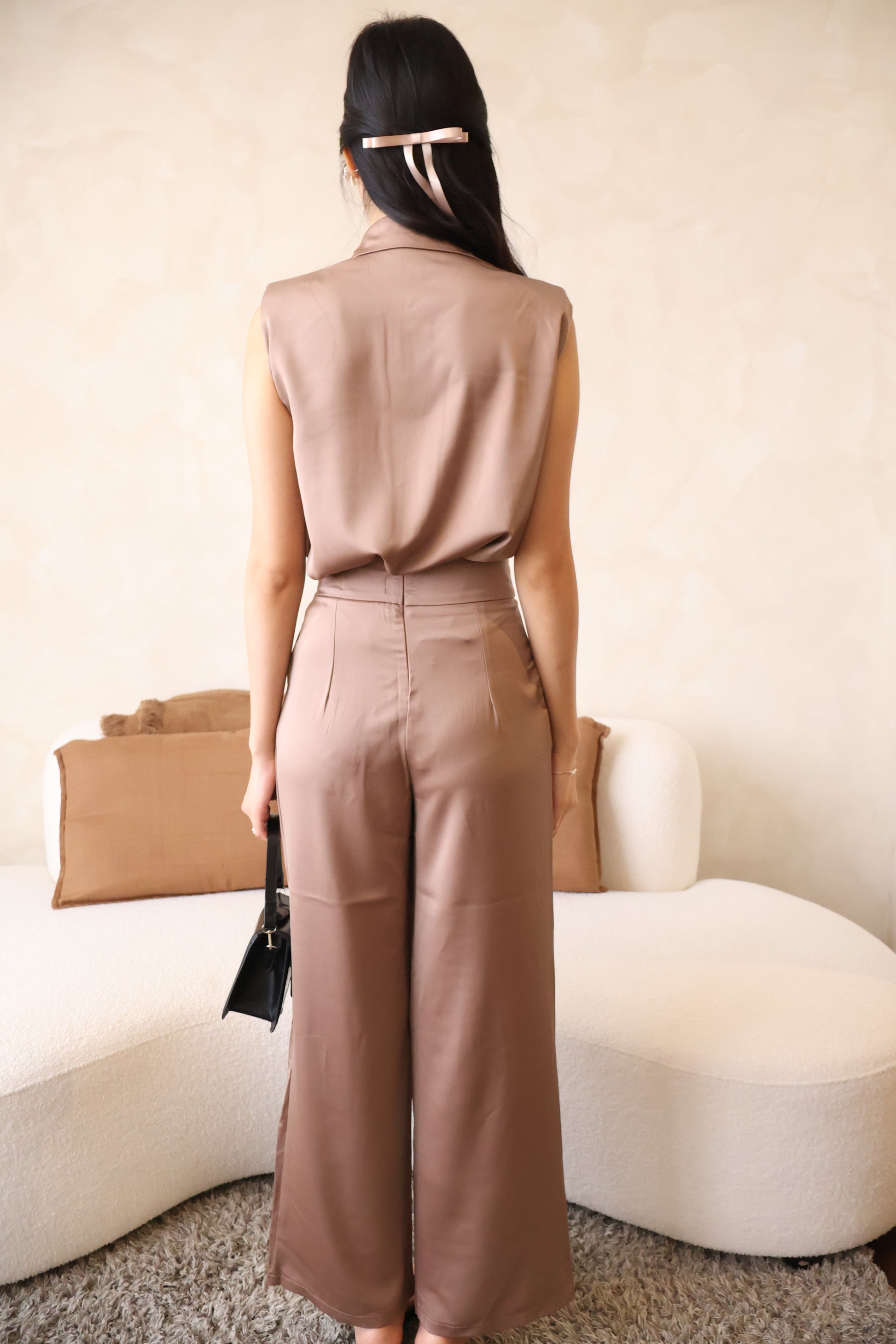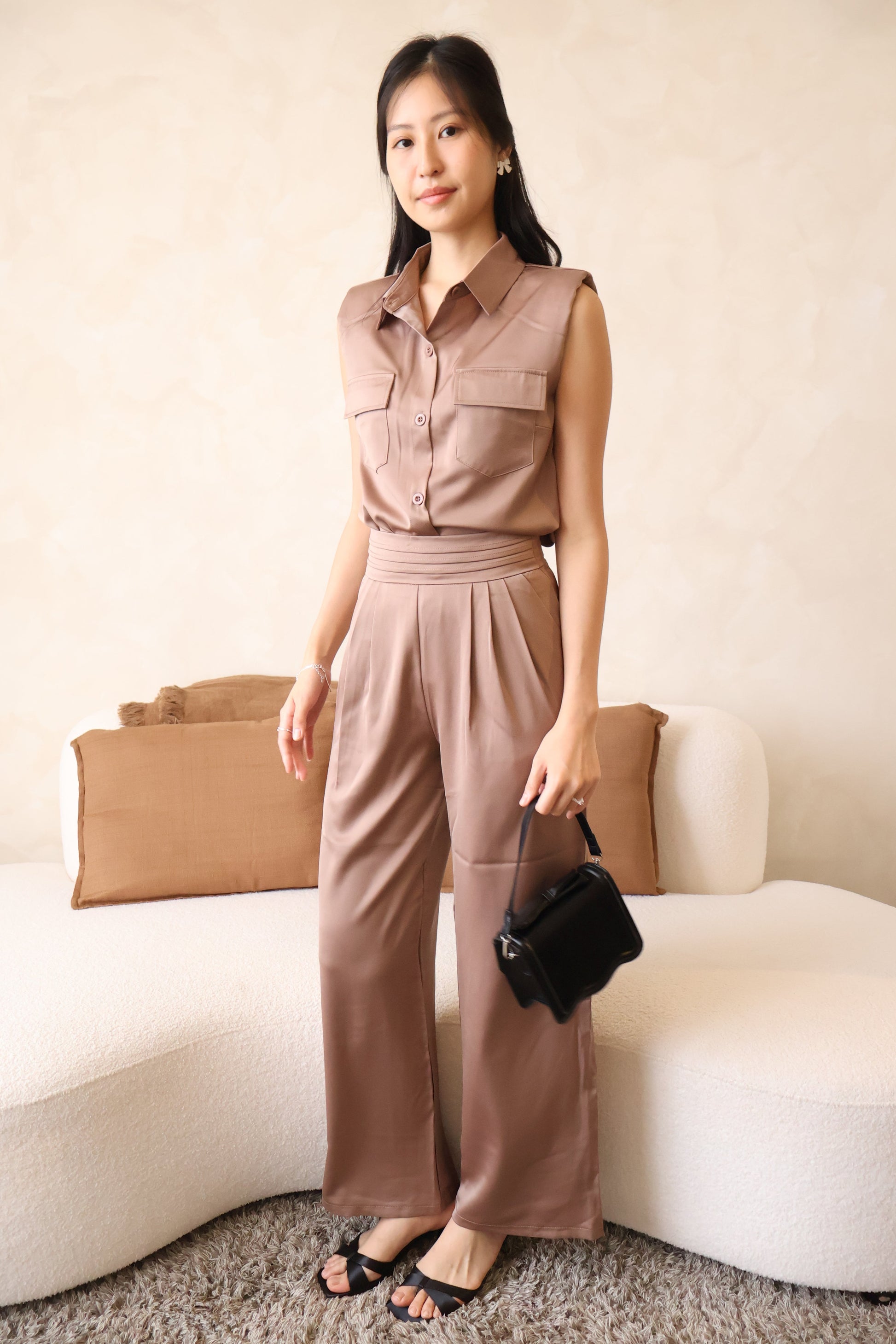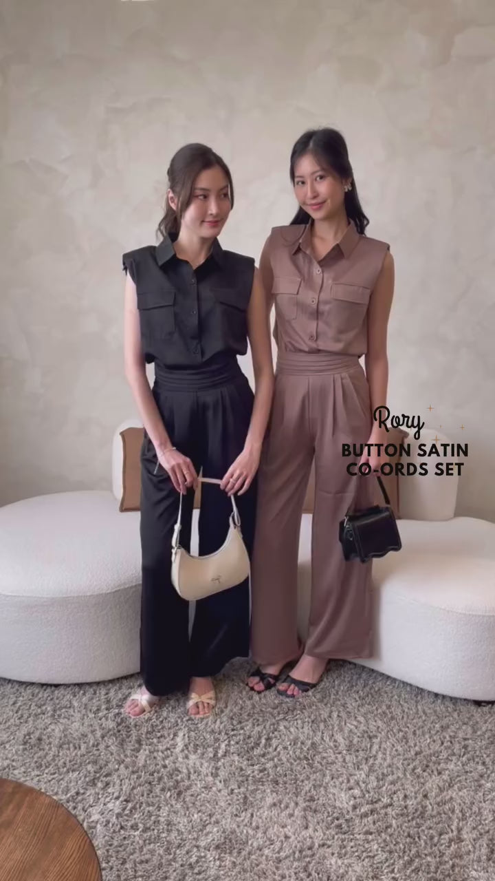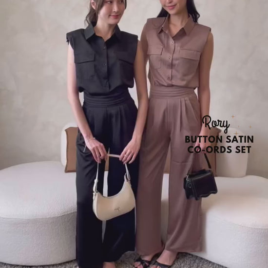Your new go-to for effortless style ✨ Rory features a luxe satin finish in a 2-piece co-ords set—button blouse + matching pants with functional pockets. Worn tucked out, it channels laid-back, relaxed vibes. Tucked in? Instantly polished and put-together. This slip-on-and-go set is perfect for lazy weekends, quick errands, or elevated lounging. Comes in muted, easy-to-match shades of Black, Champagne, and Earth. Comfortable, versatile, and oh-so-chic—Rory’s got you covered from couch to café.