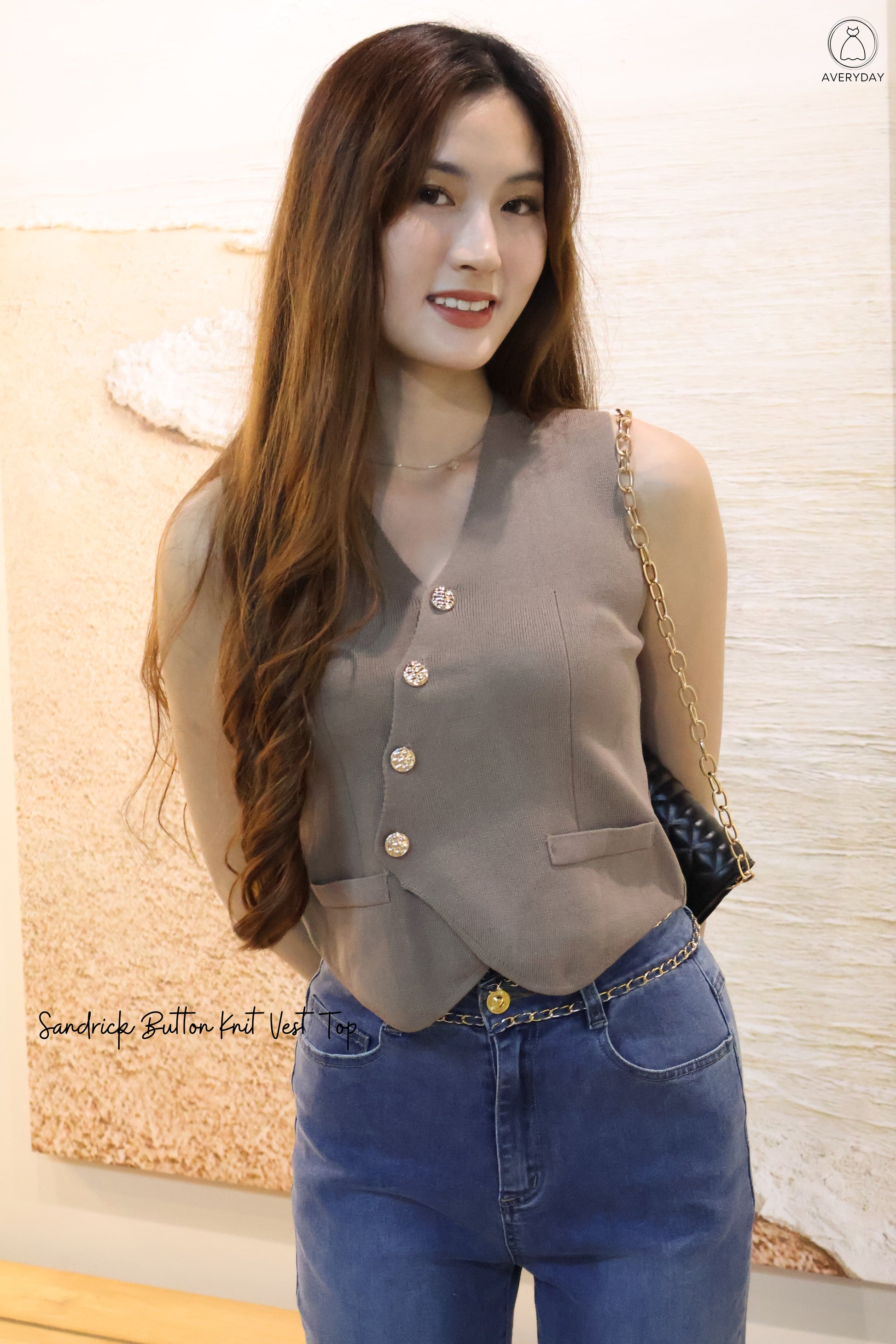 Timeless, effortless, and undeniably chic — Sandrick is your go-to vest top this season. Crafted in a cooling knit fabric, it keeps you comfortable in our warm weather while giving you that laid-back, off-duty charm. Designed in elegant earth shades for an old-money aesthetic, this piece is elevated with polished gold buttons that add just the right touch of class.